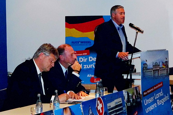 Mit humorvollen Überlegungen darüber, welche der bisherigen Bundestagsparteien denn eigentlich von demokratischer Gesinnung und damit überhaupt wählbar sei, begann der vorsitzende Bundesparteisprecher Professor Jörg Meuthen seinen politischen Lehrvortrag. Genüßlich zerlegt Meuthen dabei die Wahlslogans von CDU, CSU, SPD, FDP und Grünen und stellt ihnen die deutsche Realität gegenüber, die sich zum Beispiel in den sogenannten „Merkel-Legos“ (Betonklötze zum Schutz gegen terroristische Anschläge) widerspiegelt. Die Linken hingegen sind manchmal diagnostisch auf einer Linie mit der AfD, doch fehlt es der Mannschaft um Sahra Wagenknecht am richtigen therapeutischen Ansatz. Den, so verspricht Meuthen, wird die AfD ab 24. September wirkungsvoll im Bundestag umsetzen.