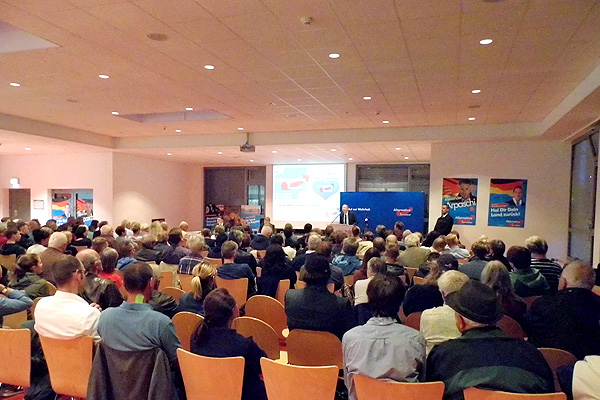 BvS, wie sie intern gerne genannt wird, gelang es, nach kurzer Fühlungnahme mit dem Publikum exakt die Themen anzuschlagen, die den Zuhörern auf den Nägeln brennen. Oft sorgenvoll, immer aber beherzt und mit gesundem Humor ging sie genau auf diejenigen Probleme unserer Zeit ein, die inzwischen in den Alltag der Deutschen eingedrungen sind. Ob es um Arbeit, Familie, Internet, Islam, Kirche, Kriminalität, Schule, Sozialwesen, Währung, Windkraft, Wohnungen, Zuwanderung geht: Der Politik der vergangenen Jahre stellte BvS, oft unterbrochen von stürmischem Beifall, die notwendigen Neuansätze entgegen, die im Programm der Alternative für Deutschland (AfD) enthalten sind.